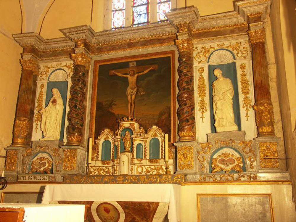 La petite vierge en bois doré qui surmonte le tabernacle est d’une finesse toute classique. Des peintures en trompe l’oeil y ont été découvertes récemment. L’ensemble, inscrit à l’inventaire des monuments historiques, vous séduira par son charme champêtre.